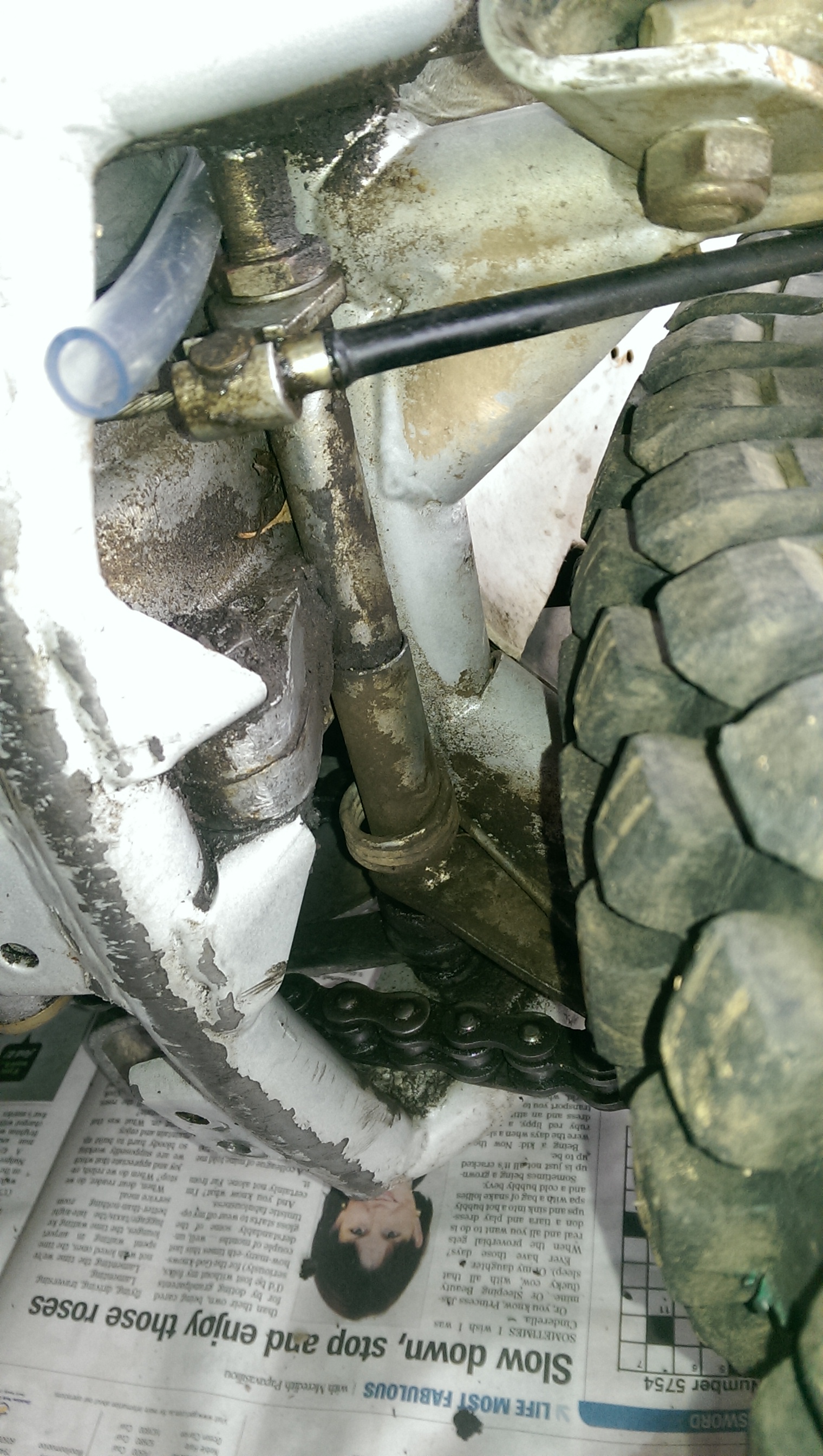 Why oh why did they do this? The chain tensioner spring acts against the brake rod. I guess the one spring does double duty - holding the brake pedal up and holding the chain tensioner arm up too. Unfortunately it means that brake pedal pressure varies with the position of the tensioner arm (as you ride) and chain tension varies with pedal position !!