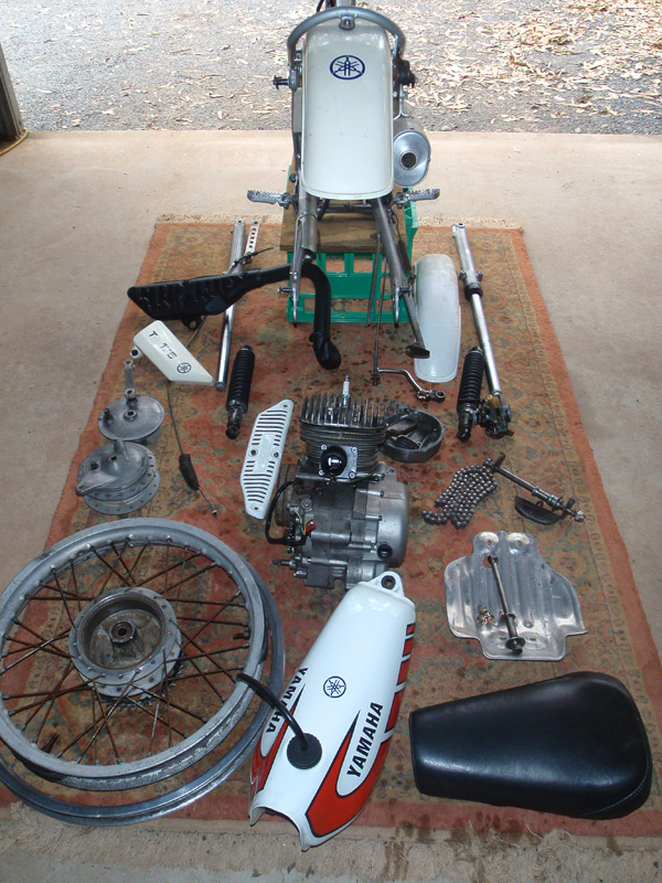 Well here it is a 1974 Yamaha TY175B that was being sold as a good bike on EBay a few weeks ago. Being told it was a good bike and sadly believing it I bought it, however, after getting it home and having a proper look at it, it was pretty obvious that this bike had been bodgied up in every way. It needs new front and rear wheel bearings, seals, spokes, brakes, tyres, fork seals, a new right fork, shockies, bash plate, points, condenser, spark plug, full gasket and seal kits and I haven’t even cracked open the crank case yet. Anyway I plan to resurrect the old girl so that she has a decent life with an honest owner who will take her out to play as much as possible, I will post more pics as we get to know each other on our little journey of restoration.