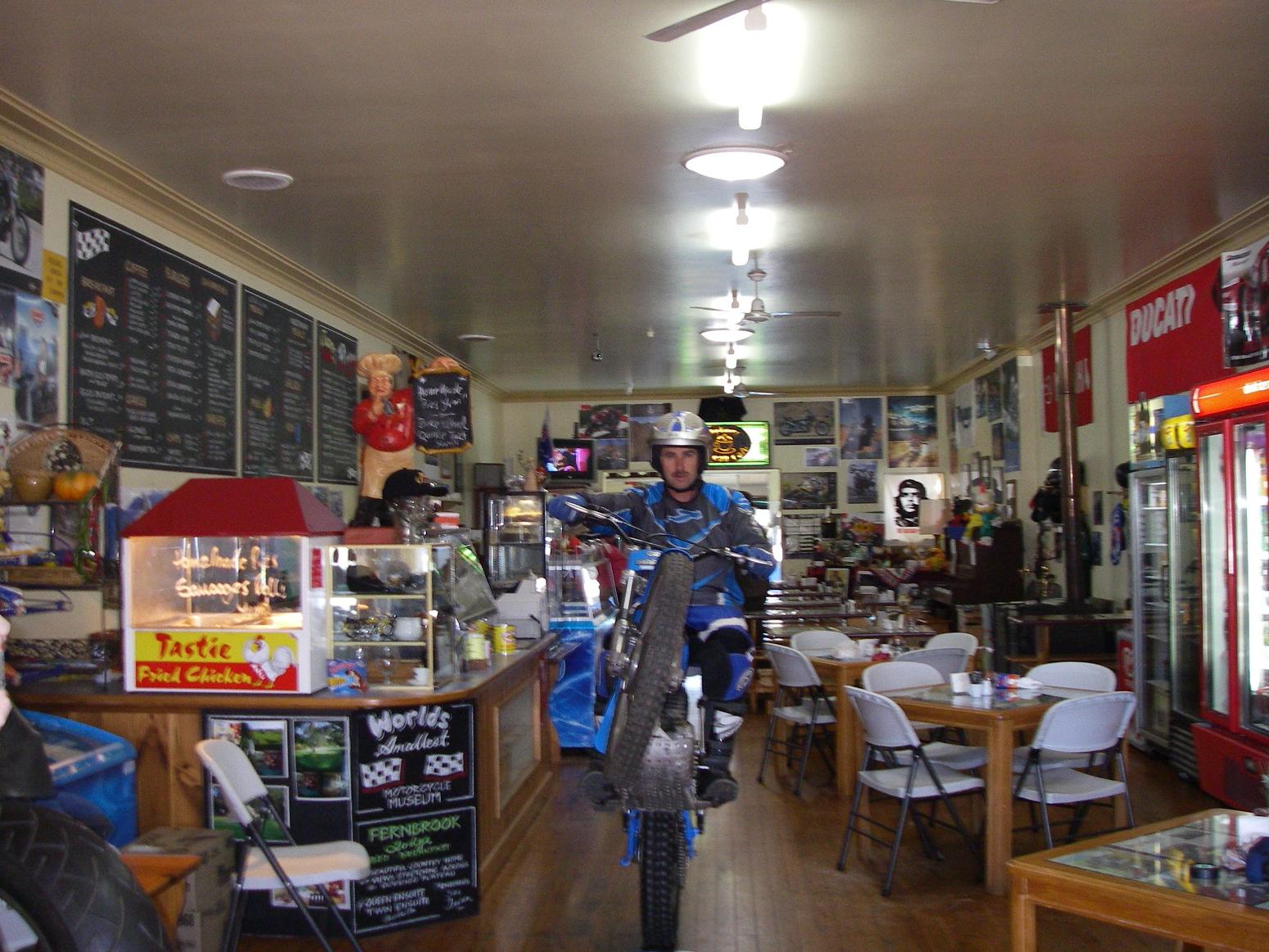 In an effort to stimulate interest in trials, I am always looking for new people to ride with and new places to ride. However, sometimes this gets me into trouble, (been known to use esculators and think this would be a great never-ending hillclimb). Anyway I found the Worlds Smallest Motorcycle Muesum and thought I would check it out, talk about not happy Juan! He decided to keep my bike, hopefully only for a while, time will tell.
