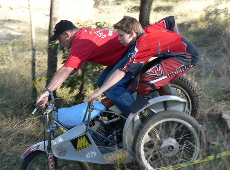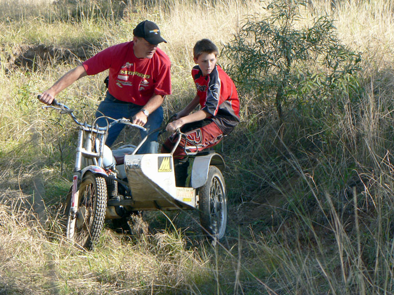 There is a photo of David Lahey’s brother in law in Dayboro in 1977 with me sitting in the background (on this site), where I conducted a trials school and rode this beast as a solo in the trial on the Sunday! It makes a very healthy twin shock sidecar as shown in photo, of my grandson and I having fun.