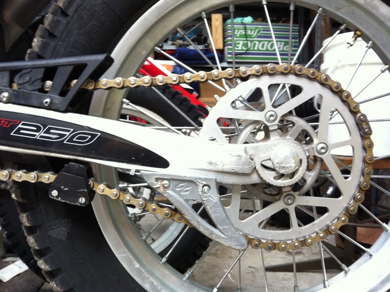 With the standard snail cam adjusters on 'full' this setup works OK when the chain is new. However as the chain stretches the tensioner comes up too far and there's nothing left in the standard adjusters: